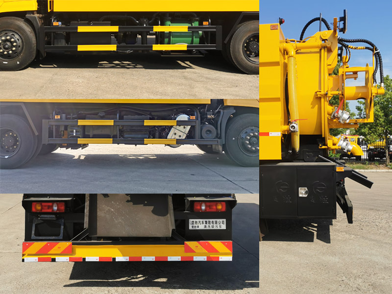 其它:該車主要用于下水道清洗及吸污,主要專用裝置為罐體、吸污泵、清洗沖刷裝置.圓形罐體外形尺寸:罐體總長度5200mm,其中直段長×直徑(mm):4900×1650;罐體前段為清水罐(總長1400mm,其中直段長1100mm),后段為污水罐(總長3800mm).圓形罐體兩側(cè)各有一個異型罐,左右對稱,均為清水罐,單側(cè)異型罐罐體截面為圓弧及多邊形組成,單側(cè)異型罐外形尺寸(長×最大截面寬×最大截面高)為:3500mm×640mm×1100mm.清水罐和吸污罐為兩個獨立罐體,清洗功能時用清水罐,吸污功能時用吸污罐,兩個罐體不能同時滿載,兩種功能不能同時使用.清水罐總?cè)萘?.09立方米,有效容積5.8立方米,污水罐總?cè)萘?.61立方米,有效容積7.25立方米,側(cè)、后防護材料均為Q235,側(cè)防護螺栓連接,后防護焊接,截面尺寸(mm)220×50,下邊緣離地高420mm.僅選用底盤4700mm軸距改裝.隨底盤選裝限速裝置,限速89km/h.ABS型號/廠家:3631010-C2000/東科克諾爾商用車制動系統(tǒng)(十堰)有限公司,ABS 8/東科克諾爾商用車制動系統(tǒng)(十堰)有限公司, 4460046450/威伯科汽車控制系統(tǒng)(中國)有限公司,J ABS/焦作博瑞克控制技術(shù)有限公司.隨底盤選裝駕駛室.